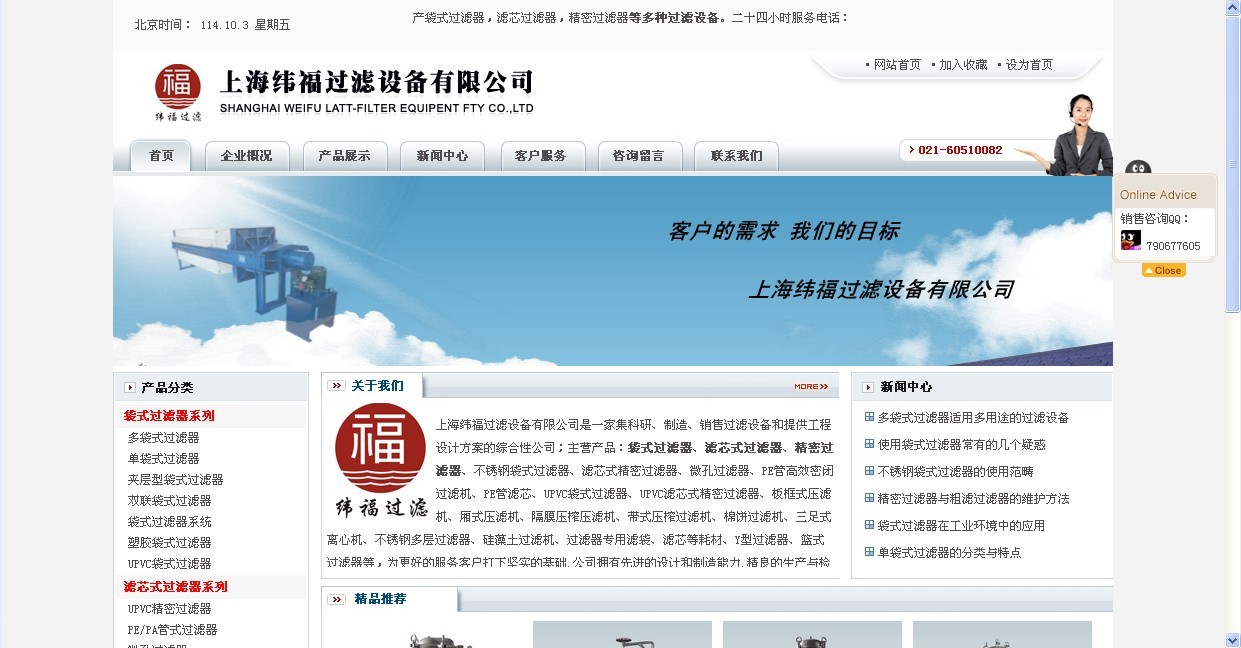3个工作日完工设计,客户选定网站样板,上海网站设计专家-润壤网络为纬福过滤设备网站局部修改调整并制作FLASH动画。整个网站白色底,天蓝色搭配,突出公司产品和公司文化。